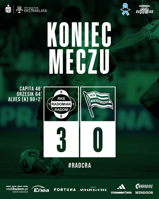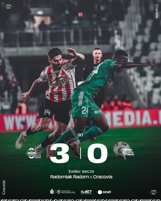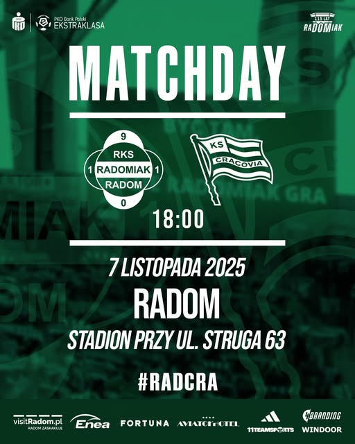 Pierwsze spotkanie w ramach 15 kolejki polskiej PKO BP Ekstraklasy sezonu 2025/2026. Na Stadionie im. braci Czachorów przy ulicy Struga 63 w Radomiu RKS Radomiak Radom podejmował KS Cracovię. Gospodarze bili się o utrzymanie. Przed tą kolejką zajmowali ósme miejsce w ligowej tabeli ze stratą DZIESIĘCIU PUNKTÓW do liderującego Górnika Zabrze. W pięciu ostatnich meczach ligowych Zieloni odnieśli dwa zwycięstwa (u siebie z KGHM Zagłębiem Lubin 3:1 i na wyjeździe z Lechią Gdańsk 1:2), dwa razy zremisowali (na wyjeździe z Motorem Lublin 2:2 i u siebie z Wisłą Płock 1:1) i PONIEŚLI TYLKO JEDNĄ PORAŻKĘ (na wyjeździe z RTS Widzewem Łódź 3:2). W kadrze meczowej ekipy Gonçalo Feio, na starcie z Krakowianami, zabrakło Joshuy Dariusa Kamaniego Wilsona-Esbranda (Josha Wilsona-Esbranda – kontuzja mięśniowa). Goście walczyli o pierwsze Mistrzostwo Polski od sezonu 1947/1948. Przed tą serią gier byli na czwartej pozycji ze stratą siedmiu oczek do liderującego Górnika Zabrze. W pięciu ostatnich pojedynkach ligowych Pasy ODNIOSŁY TYLKO JEDNO ZWYCIĘSTWO (u siebie z RKS Rakowem Częstochowa 2:0), dwa razy zremisowały (u siebie z Górnikiem Zabrze 1:1 i KGHM Zagłębiem Lubin 0:0) i poniosły dwie porażki (na wyjeździe z MZKS Arką Gdynia 2:1 i MKS Pogonią Szczecin 2:1). W kadrze meczowej ekipy Luki Elsnera, na spotkanie z Warchołami, zabrakło Kamila Glika (uraz kolana). Która z drużyn zbliżyła się do swojego celu? Czy RKS Radomiak Radom odskoczył od grupy pościgowej? Czy KS Cracovia pozostała w grze o Mistrzostwo Polski? Przekonajmy się.