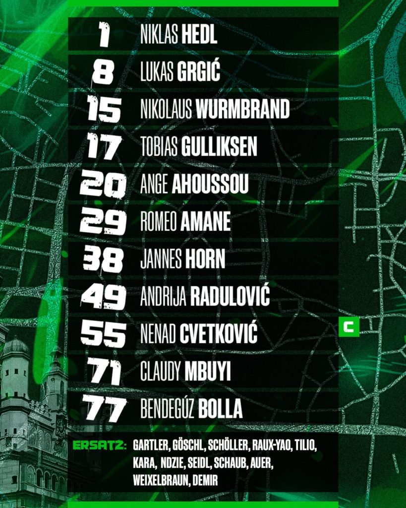 Porównując jedenastkę gości z wygranego spotkania rewanżowego domowego w ramach czwartej rundy eliminacji do fazy ligowej UEFA Conference League 2025/2026 z ETO FC Győr, z tą, która wybiegła na Enea Stadionie przy ulicy Bułgarskiej 17 w Poznaniu, Peter Stöger dokonał czterech roszad. Poza kadrą meczową, z powodu kontuzji mięśniowej bądź decyzji trenera, znaleźli się Petter Dahl czy Janis Antiste, a na ławce rezerwowych zasiedli Serge-Philippe Raux-Yao i Matthias Seidl. W ich miejsce, od pierwszej minuty, pojawili się Andrija Radulović, Tobias Gulliksen, Kouadio Guy Ange Ahoussou (Ange Ahoussou) oraz Lukas Grgić. Czy te zmiany spowodowały lepszą grę w obronie i ataku Die Grün-Weißen?