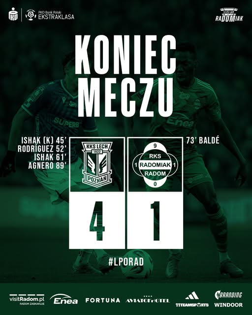 Sędzia Piotr Lasyk zakończył szóste starcie w ramach 16 kolejki polskiej PKO BP Ekstraklasy sezonu 2025/2026 rozegrane na Enea Stadionie przy ulicy Bułgarskiej 17 w Poznaniu. Pierwsza połowa to optyczna przewaga miejscowych. Wykreowali kilkanaście okazji strzeleckich, z których wykorzystali jedną. Przyjezdni szukali swoich szans po kontratakach, ale zabrakło im wykończenia. Druga połowa to znaczna dominacja gospodarzy. Stworzyli kilkanaście sytuacji podbramkowych, z których wykorzystali trzy. Goście szukali swoich szans po szybkich atakach, z których wykorzystali jeden. Najlepszymi piłkarzami tego pojedynku byli Filip Jagiełło i Zié Ouattara. Po tym spotkaniu Lechici awansowali na czwarte miejsce w ligowej tabeli, a Warchoły spadły na siódmą pozycję. W następnej kolejce ligowej ekipa Nielsa Frederiksena zagra na Orlen Stadionie im. Kazimierza Górskiego w Płocku z Wisłą Płock, natomiast zespół Gonçalo Feio zmierzy się na Stadionie im. braci Czachorów przy ulicy Struga 63 w Radomiu z Górnikiem Zabrze. Ostatecznie, w szóstym meczu 16 kolejki PKO BP Ekstraklasy 2025/2026, KKS Lech Poznań pokonał na Enea Stadionie przy ulicy Bułgarskiej 17 w Poznaniu RKS Radomiaka Radom 4:1. Gole dla Kolejorza strzelili dwa Mikael Ishak, Pablo Rodríguez i Yannick Agnero, a bramkę dla Zielonych zdobył Elves Baldé.