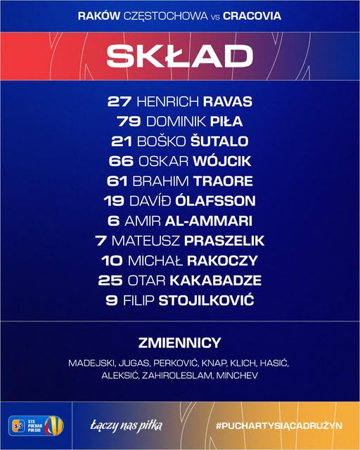 Dwunaste spotkanie w ramach 1/16 finału rozgrywek o piłkarski STS Puchar Polski sezonu 2025/2026. Pierwszy z dwóch hitów tej rundy zmagań o krajowy puchar. Na zondacrypto Arenie w Częstochowie RKS Raków Częstochowa podejmował KS Cracovię. Gospodarze bili się o odzyskanie utraconego przed dwoma laty Mistrzostwa Polski. Przed 14 kolejką PKO BP Ekstraklasy 2025/2026 zajmowali ósme miejsce w ligowej tabeli ze stratą dziewięciu punktów do liderującego Górnika Zabrze. W pięciu ostatnich meczach w STS Pucharze Polski Krzyżowcy odnieśli dwa zwycięstwa (na wyjeździe z ŁKS-em Łódź 0:2 po dogrywce i u siebie z KS Cracovią 1:0 po dogrywce), dwa razy zremisowali (na PGE Narodowym w Warszawie z CWKS Legią Warszawa 0:0 po dogrywce – w rzutach karnych 6:5 i na wyjeździe z MKS Miedzią Legnica 0:0 po dogrywce – w rzutach karnych 4:3) i PONIEŚLI TYLKO JEDNĄ PORAŻKĘ (na wyjeździe z GKS Piastem Gliwice 3:0). W kadrze meczowej ekipy Marka Papszuna, na starcie z Krakowianami, zabrakło Zorana Arsenicia (złamanie kości strzałkowej i piszczelowej), Vladyslava Sergeyevicha Kochergina (Vladyslava Kochergina – kontuzja kolana) i Ericka Oumy Otieno (Ericka Otieno – uraz ścięgna Achillesa). Goście walczyli o pierwsze Mistrzostwo Polski od sezonu 1947/1948. Przed 14 serią gier PKO BP Ekstraklasy 2025/2026 byli na czwartej pozycji ze stratą pięciu oczek do liderującego Górnika Zabrze. W letnim okresie transferowym Biało-Czerwoni pozyskali Macieja Mrozika (powrót z KSZO Ostrowiec Świętokrzyski z wypożyczenia), Damiana Urbana (powrót ze Stali Stalowa Wola z wypożyczenia), Karola Knapa (powrót z FKS Stali Mielec z wypożyczenia), Janiego Atanasova (powrót z MKS Puszczy Niepołomice z wypożyczenia), Michała Rakoczego (powrót z MKE Ankaragücü z wypożyczenia), Bartłomieja Kolca (powrót z Wiślan Master Way Skawina z wypożyczenia), Filipa Stojilkovicia (transfer definitywny z SV Darmstadt 98), Dominika Piłę (transfer definitywny z Lechii Gdańsk), Mateusza Praszelika (transfer definitywny z Hellasu Verona), Konrada Cymerysa (transfer definitywny z KS Siarki Tarnobrzeg), Tomasza Walaszka (wypożyczenie z BTS Rekordu Bielsko-Biała), Dijona Kameriego (transfer definitywny z FC Red Bull Salzburg), Kahveha Zahiroleslama (transfer definitywny z VV St. Truiden), Mateusza Klicha (transfer definitywny z Atlanty United FC), Boško Šutalo (wypożyczenie z Royalu Standardu de Liége), Brahima Traoré (transfer definitywny z SM Caen), Milana Aleksicia (wypożyczenie z AFC Sunderlandu), Gabriela André Josepha Charpentiera (Gabriela Charpentiera – transfer definitywny z Parmy Calcio 1913) i Mateusza Skoczylasa (transfer definitywny z AC Milan). Dodatkowo stracili Jakuba Burka (powrót do Wisły Płock z wypożyczenia), Filipa Rózgę (transfer definitywny do SK Sturmu Graz), Adama Wierzbickiego (przeniesienie do drużyny młodzieżowej), Jakuba Pestkę (transfer definitywny do MLKS Sparty Kazimierza Wielka), Alana Mazura (przeniesienie do drużyny młodzieżowej), Franciszka Żubika (przeniesienie do drużyny młodzieżowej), Wiktora Piekarza (przeniesienie do drużyny młodzieżowej), Maksymiliana Czerwińskiego (przeniesienie do drużyny młodzieżowej), Oliwiera Kuklińskiego (przeniesienie do drużyny młodzieżowej), Mateusza Pomietło (przeniesienie do drużyny rezerw), Oliwiera Hyłę (przeniesienie do drużyny rezerw), Bartłomieja Kolca (nieprzedłużenie wygasającego kontraktu), Oskara Lachowicza (przeniesienie do drużyny rezerw), Micka van Burena (transfer definitywny do FC Hradec Králové), Kacpra Śmiglewskiego (wypożyczenie do MKS Puszczy Niepołomice), Arttu Hoskonena (transfer definitywny do Stockport County FC), Janiego Atanasova (transfer definitywny do AEL Larissa), Patryka Janasika (transfer definitywny do KS Polonii Warszawa), Fabiana Bzdyla (transfer definitywny do MŠK Žilina), Andreasa Skovgaarda Larsena (Andreasa Skovgaarda – transfer definitywny do Bryne FK), Szymona Dobę (transfer definitywny do GKS Górnika Łęczna), Macieja Mrozika (transfer definitywny do KSZO Ostrowiec Świętokrzyski), Damiana Urbana (transfer definitywny do ChKS Chełmianki Chełm), Patryka Sokołowskiego (transfer definitywny do WKS Śląska Wrocław), Benjamina Källmana (transfer definitywny do Hannoveru 96) i Virgila Eugena Ghiță (Virgila Ghiță – transfer definitywny do Hannoveru 96). W pięciu ostatnich pojedynkach w STS Pucharze Polski Pasy odniosły trzy zwycięstwa (u siebie z KGHM Zagłębiem Lubin 1:0 oraz na wyjeździe z GKS Górnikiem Łęczna 3:4 i 1:5) i poniosły dwie porażki (na wyjeździe z RKS Rakowem Częstochowa 1:0 po dogrywce i MKS Sandecją 1910 Nowy Sącz 3:2 po dogrywce). W kadrze meczowej zespołu Luki Elsnera, na spotkanie z Medalikami, zabrakło Kamila Glika (kontuzja kolana). Która z drużyn awansowała do 1/8 finału STS Pucharu Polski 2025/2026? Przekonajmy się.
