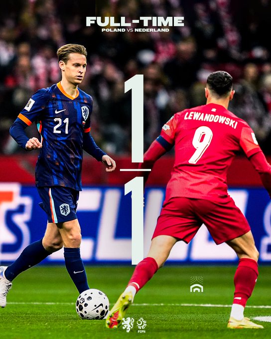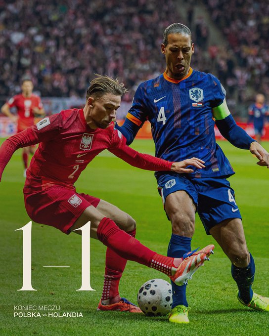 Sędzia Maurizio Mariani zakończył dziesiąte starcie w ramach listopadowej pierwszej tury eliminacji do fazy grupowej piłkarskich Mistrzostw Świata 2026 rozegrane na PGE Narodowym w Warszawie. Pierwsza połowa to optyczna przewaga przyjezdnych. Wykreowali kilkanaście okazji strzeleckich, ale zabrakło im wykończenia. Miejscowi szukali swoich szans po kontratakach, z których wykorzystali jeden. Druga połowa to nieznaczna dominacja gości. Stworzyli kilkanaście sytuacji podbramkowych, z których wykorzystali jedną. Gospodarze szukali swoich szans po szybkich atakach, ale zabrakło im wykończenia. Najlepszymi piłkarzami tego pojedynku byli Jakub Kamiński i Frenkie de Jong. Po tym spotkaniu Orły utrzymały drugie miejsce w tabeli grupy G, a Pomarańczowi zostali na pierwszej pozycji w tabeli grupy G. W ostatniej kolejce eliminacji do rundy grupowej Mundialu 2026 ekipa Jana Urbana zagra na Ta’Qali National Stadium w Ta’Qali z Maltą, natomiast zespół Ronalda Koemana zmierzy się na Johan Cruijff Arenie w Amsterdamie z Litwą. Ostatecznie, w dziesiątym meczu listopadowej pierwszej tury eliminacji do fazy grupowej Mistrzostw Świata w 2026 roku, Reprezentacja Polski zremisowała na PGE Narodowym w Warszawie z Reprezentacją Holandii 1:1. Gola dla Biało-Czerwonych strzelił Jakub Kamiński, a bramkę dla Oranje zdobył Memphis Depay.